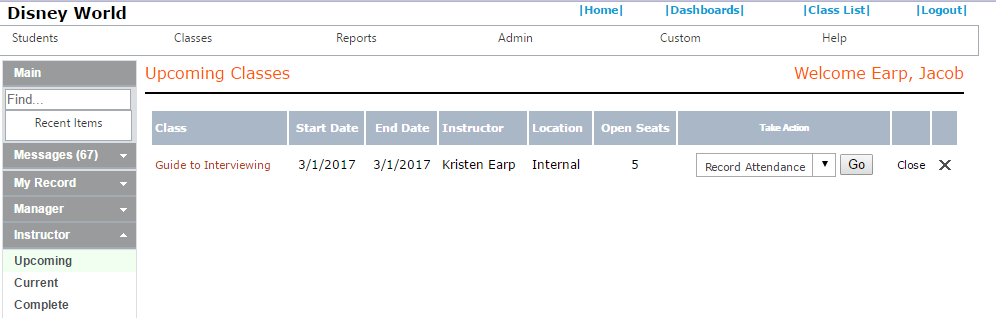 The Class Name in the Class column is a hyperlink to the Class File depending on one's security permissions. Typically, the trainer sees a Take Action column as it allows for email, record attendance, grade tests, close the class, etc... Select the desired option and click the Go button.