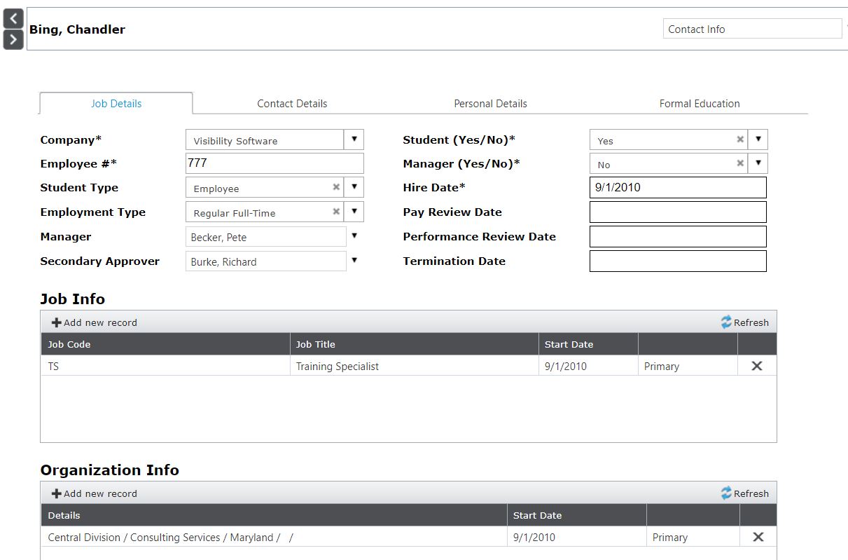 The Contact Info Page contains all job details, contact details, personal details and formal education for the student (employee).