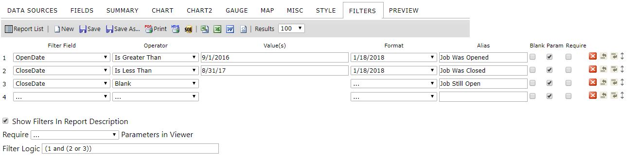 Check this box to include the filters when printing the report. This is very handy if the report is going to be distributed. |