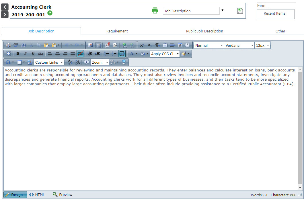 Step 1: Define which sections of the Job Description page (2nd image) will be used to create the job description in JobTarget. Keep in mind that this DOES NOT have to be the full job description which is posted to the careers site. This could be a job board specific description intended to generate interest to drive applicants back to your website to see the full description.