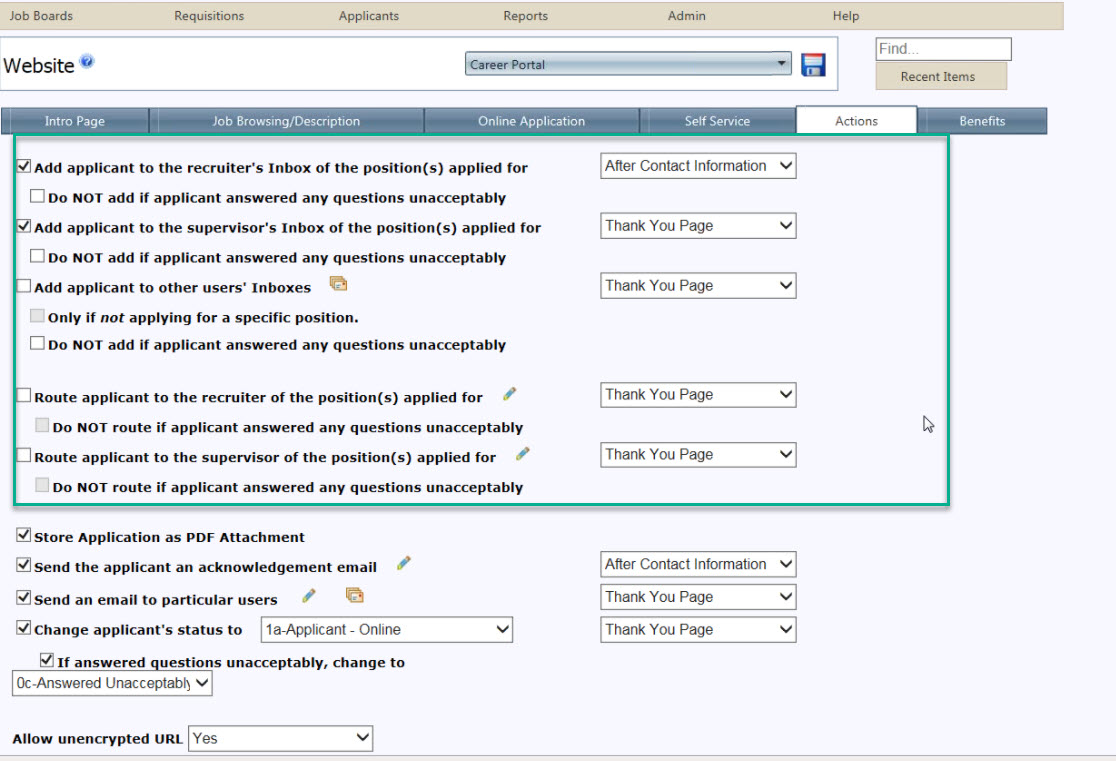 Prompts the user to enter a selection for the Skip Recruiter field which will allow an individual position to bypass the defaults settings defined in the website configuration evaluation of the applicant. Please note that this only applies to the settings highlighted in the image below: