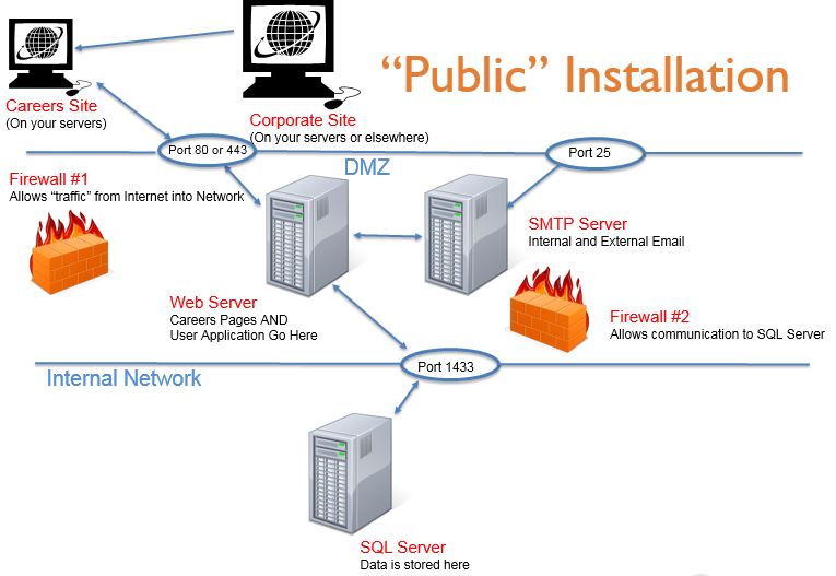 Use this installation example if there are multiple locations or the company wants user’s to be able to remotely access the system and WON’T be using a VPN or similar technology to access the user pages. Software will be loaded on a network server, the careers site and Cyber Recruiter are public, SQL and the mail server will be behind firewalls.