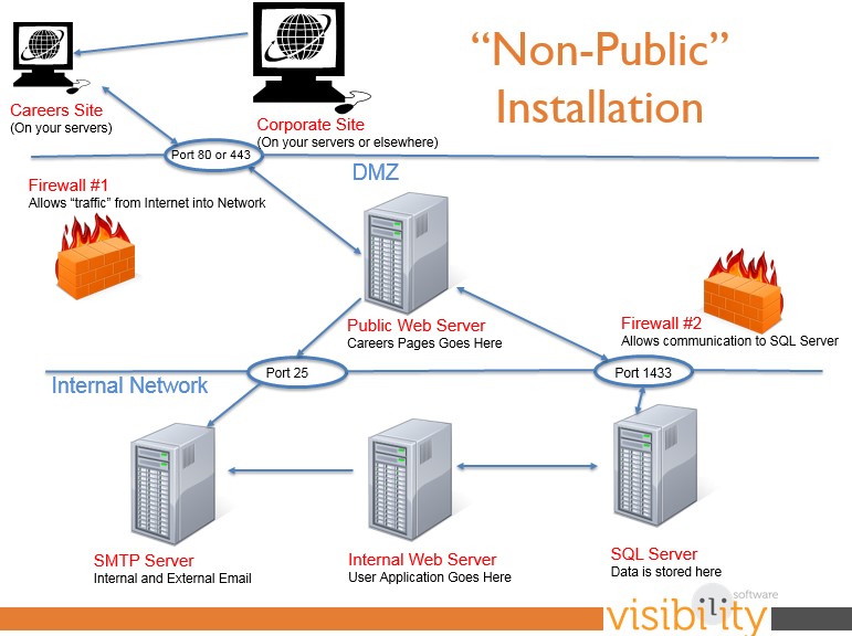 The diagrams below are examples only. Your IT infrastructure may be set up differently. These images are provided as a graphical representation of the installation and configuration for Cyber Recruiter and its supporting web pages. If the desired configuration is not shown, please contact Visibility Software Technical Support or your Implementation Consultant.