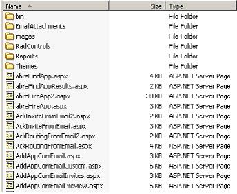 Solution: First, check the Cyber Recruiter installation folder; it should have the folder structure seen below. If the files seem to have been installed correctly, open up Internet Services Manager; find the Cyber Recruiter virtual directory or website and right click properties. If there is a tab in that says “.NET Framework”, go to that tab and make sure that the .NET Framework 2.0 is chosen, not 1.1. If .NET Framework 2.0 is already chosen, please call Technical Support for additional assistance.