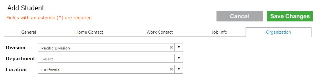 There are up to five (5) fields that could show on this page and it is optional to track a student's place in the organizational structure of the company. Codes are pulled from Admin > Codes > Organization.