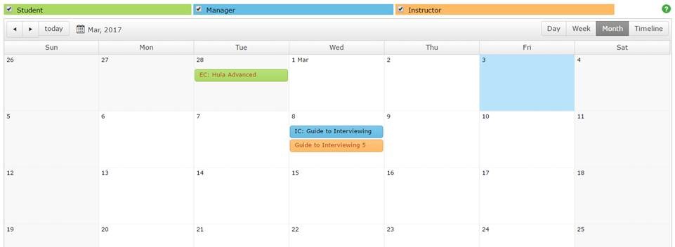 The Calendar section of the Home Page is a to help with a visual representation of requirements and classes. Once can see views by: Student, Manager and/or Instructor.