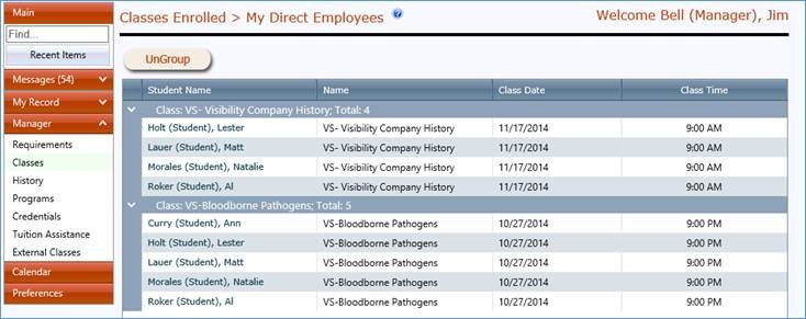 The Classes section is where Managers go to see what classes their employees are currently enrolled. Once the class is completed and closed, the information disappears from this area of the system. It truly only holds what is current. Security permissions for this section of the Manager Home Page is determined in the Security > Home Page setup.