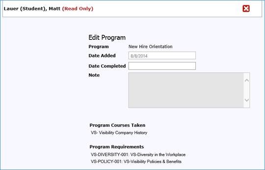 When all outstanding requirements ( Program Requirements) are satisfied, the program is considered complete and requirements are only displayed in the Program Courses Taken section. This page is truly a 'Read-Only' page such that you cannot change anything here. To leave this page, click the red-X at the top right-hand side of the page. If you see something that is not correct, contact your organization's Training Admin to help resolve the issue.