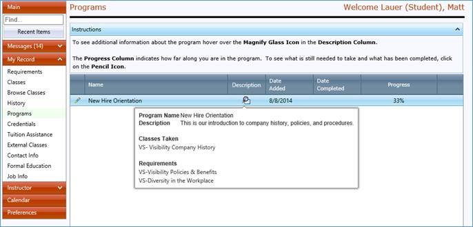The Programs section is where Students (Employees) can go to see what programs they are enrolled in and the progress they have made in completing the program. Programs are a great way to group several requirements together for a common purpose.