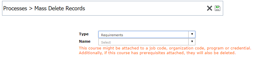 Depending on the option chosen from the list above for Requirements, Courses Taken, Programs, or Credentials, the fields displayed on the page will display the Type and the Name field. From the Name field choose the specific Requirement, Course Taken, Program or Credential to delete.