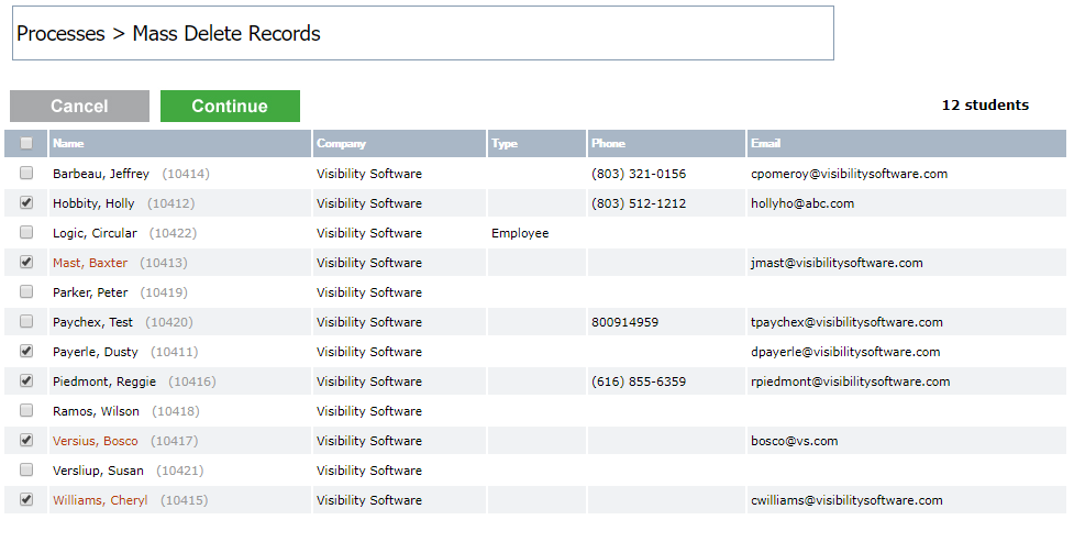 The Mass Delete Records menu item of Admin > Processes allows a User the ability to delete Requirements, Courses Taken, Programs or Credentials from a selected group of students in one action. This process CANNOT be undone. Visibility Software recommends your IT team doing a backup of the SQL database before taking this action. If your system is hosted by VS, please let us know and we can assist. However, if records are incorrectly deleted, you may be able to use the Admin > Processes > Mass Add Records to correct the error.